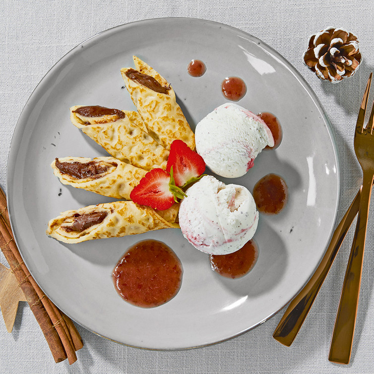 Pro Teller mit dem Pflaumenpüree kleine, punktuelle Fruchtspiegel tropfen. Die Pfannkuchen schräg halbieren und auf den Tellern anrichten. Dazu zwei Kugeln Eis anrichten und mit den Erdbeeren dekorieren.