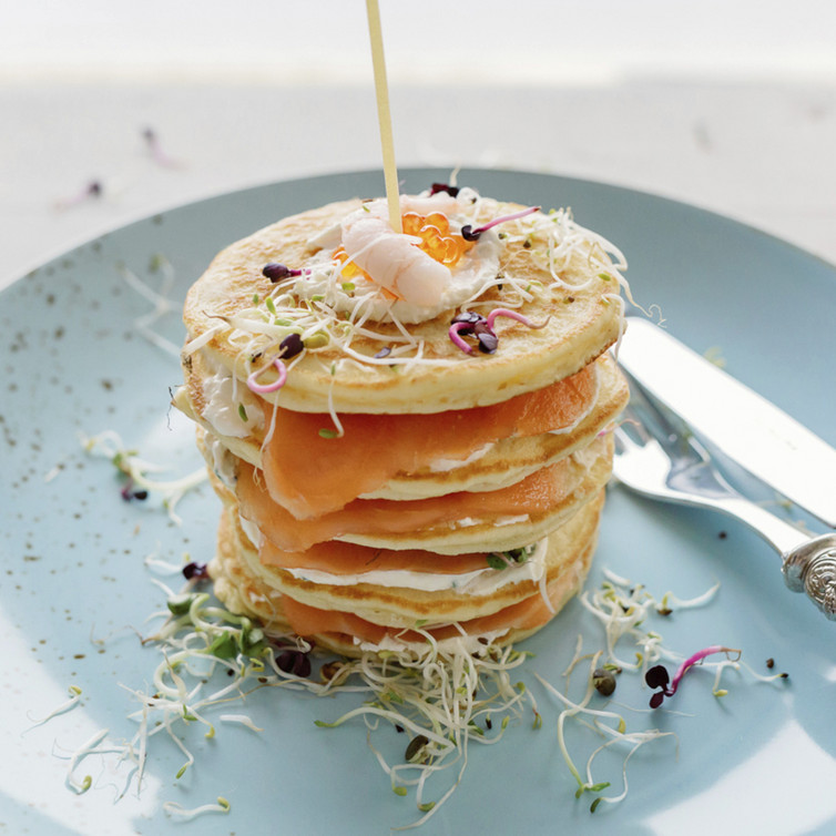 Pro Portion je 4 Pancakes mit Creme Fraîche auf einer Seite bestreichen, mit einer halben Scheibe Lachs belegen und übereinanderstapeln. Auf den letzten Pancake eine Tupfen Creme Fraîche geben und mit Riesengarnele, Forellenkaviar und Sprossenvielfalt dekorieren. Die Pancakes mit Spieß fixieren.