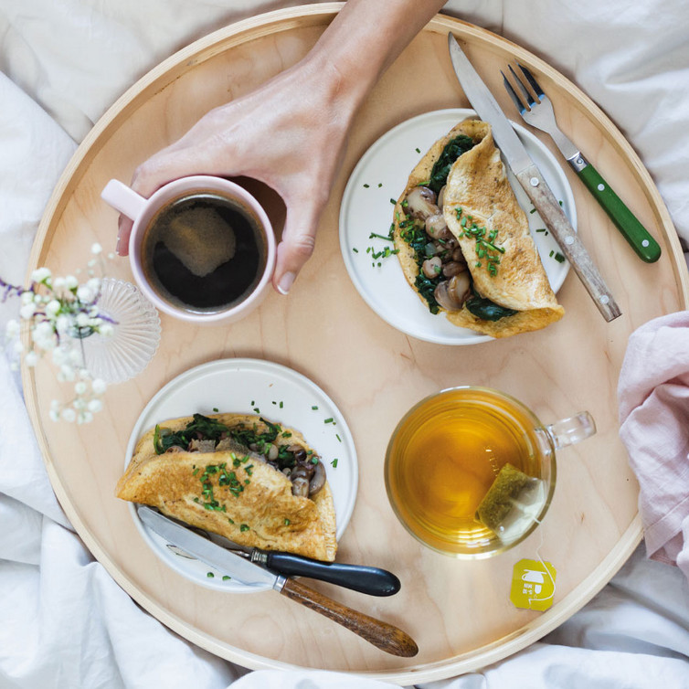 Servieren Sie das Omelett aufgeklappt und mit der Pilz-Spinatfüllung und mit Schnittlauchröllchen bestreut.
