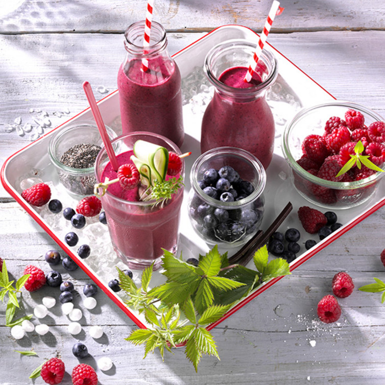 Wer mag, kann den Smoothie mit Baisertropfen, Kresse oder anderen Zutaten dekorieren.