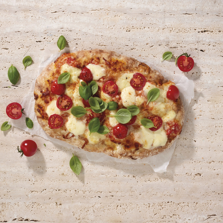 Den Backofen auf 200°C vorheizen. Die gefrorene Pinsa aus der Verpackung nehmen, auf ein Backrost legen und ca. 10 Minuten antauen lassen.