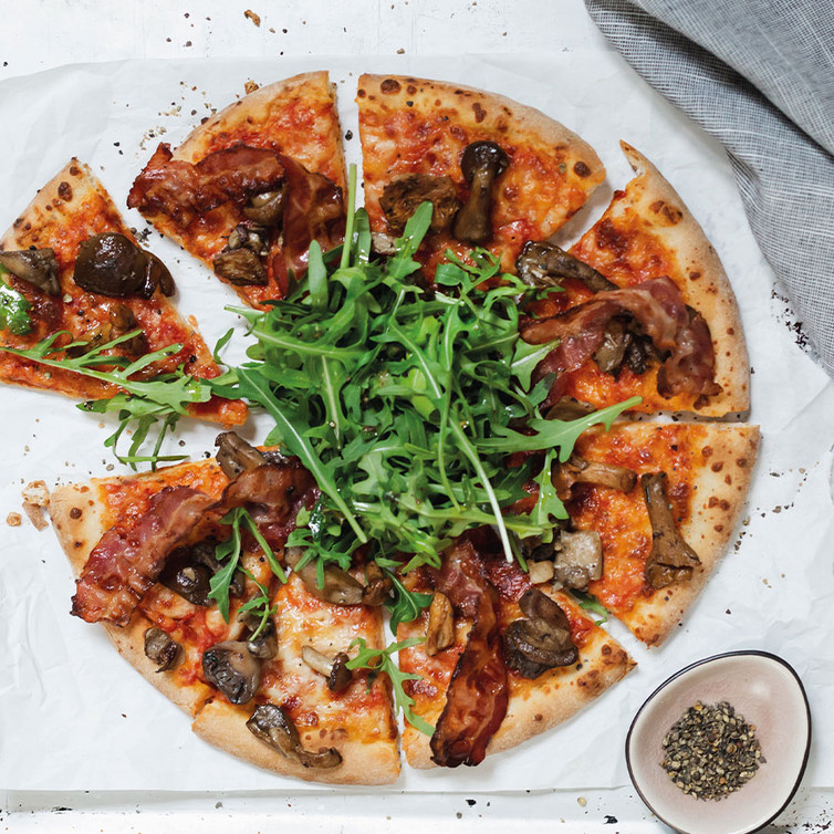 Die fertige Pizza mit Rucola, Bacon-Streifen und gebratenen Pilzen aufpimpen.