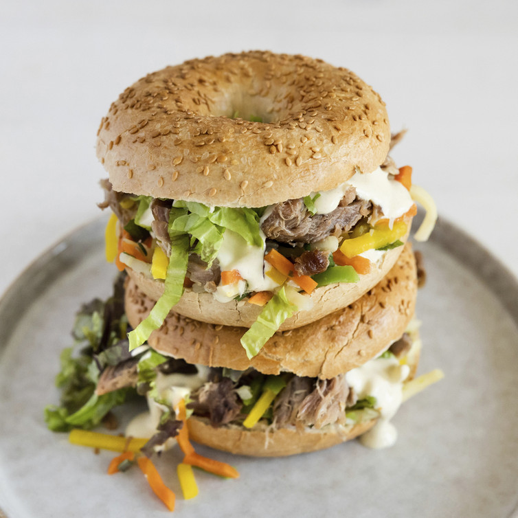 Bagel nach Packungsanleitung zubereiten, halbieren und Schnittflächen in einer heißen Pfanne ohne Fettzugabe goldbraun rösten. Salatblätter waschen und trockenschleudern. Aus Frischkäse, Bratensaft und Tomatenketchup eine Creme anrühren. Bagel mit der Creme bestreichen. Untere Hälfte mit gezupftem Fleisch, Juliennegemüse sowie Salatblatt belegen und jeweils mit der oberen Hälfte schließen.