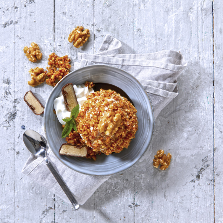 Walnussstückchen in einen Suppenteller füllen. Je 4 große Eiskugeln portionieren, direkt in den Walnüssen wälzen, auf ein Brett setzen und direkt wieder einfrieren.