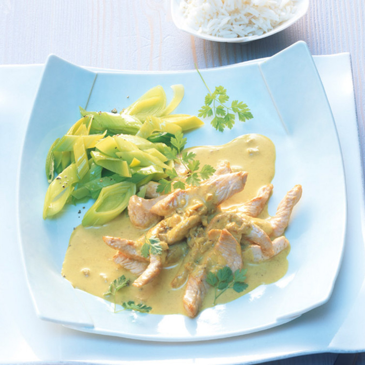 Das Fleisch dazugeben und noch einmal kurz erhitzen. Mit Salz, Pfeffer und Curry abschmecken.