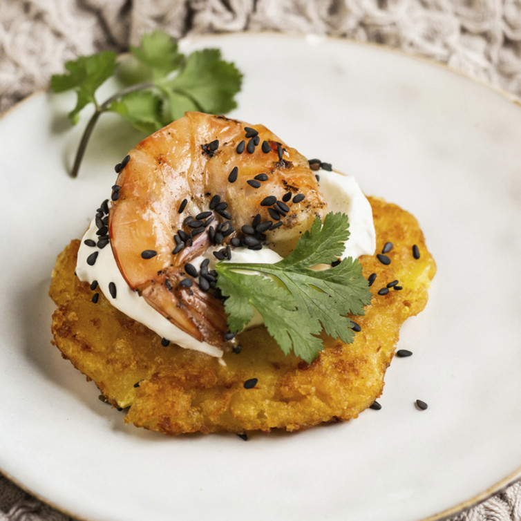 Die Röstinchen mit der Sour Creme und den Garnelen servieren und mit dem restlichen Koriander und dem gerösteten Sesam dekorieren.