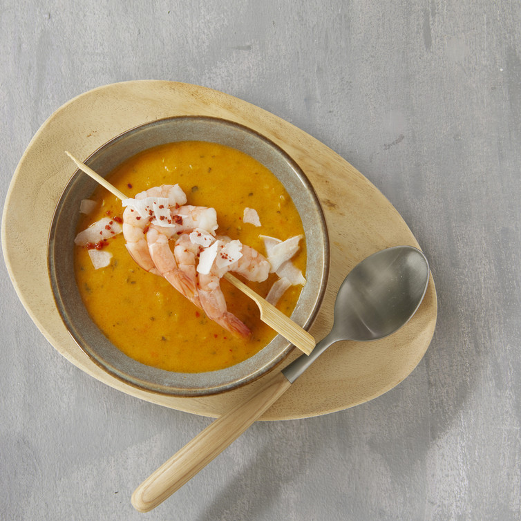 Rote Linsen-Kokos-Suppe mit Chili-Garnele