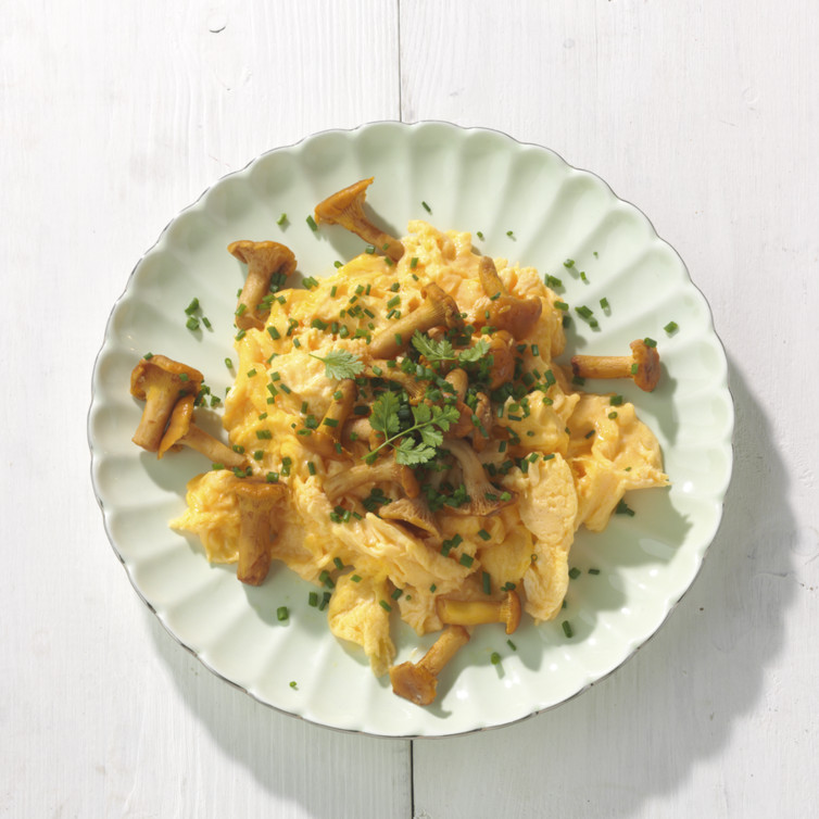 Den Rest der Butter und die Eiermilch in die Pfanne geben, etwas stocken lassen und bei mittlerer Temperatur zu Ende garen. Dabei ab und zu umrühren. Das Rührei auf einer Platte anrichten, mit den Pfifferlingen und dem Schnittlauch dekoriert servieren.