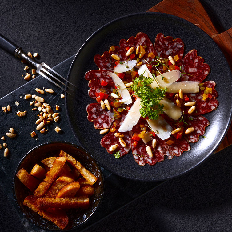 Die Salamicarpacchio mit dem Paprikaragout, den gerösteten Pinienkernen und dem Parmesan anrichten. Die Brötchen-Streifen dazu servieren.