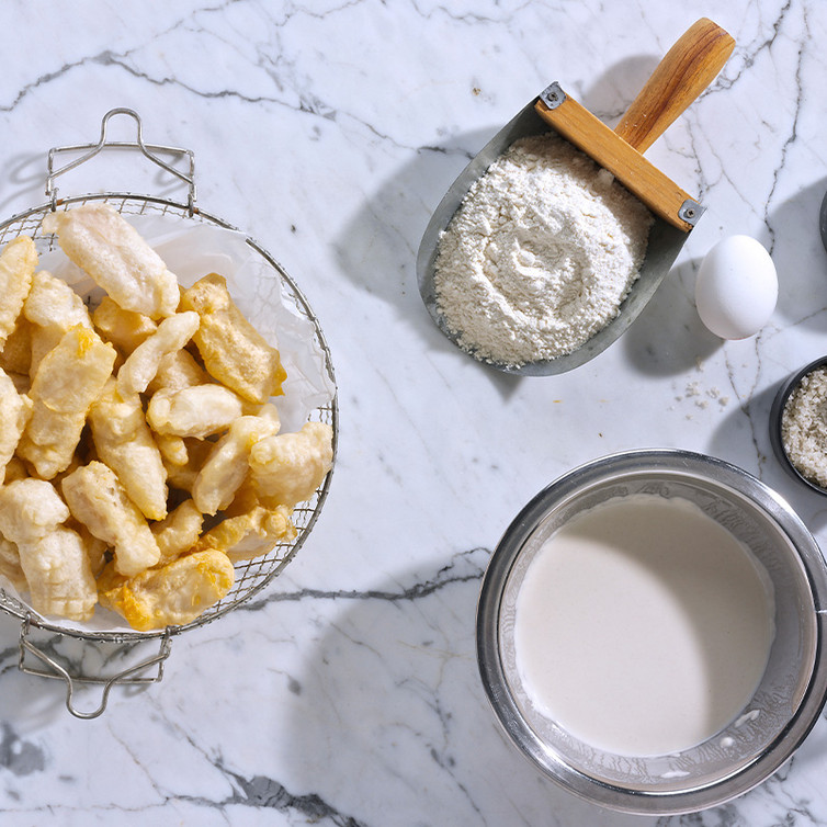 Den Fisch mithilfe von Gabeln durch den Tempurateig ziehen und überschüssigen Teig abtropfen lassen.
