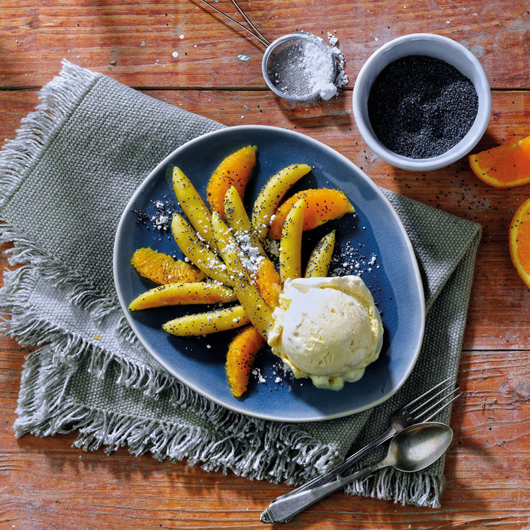 Die Orangen waschen, schälen und filetieren. Den Saft auffangen.