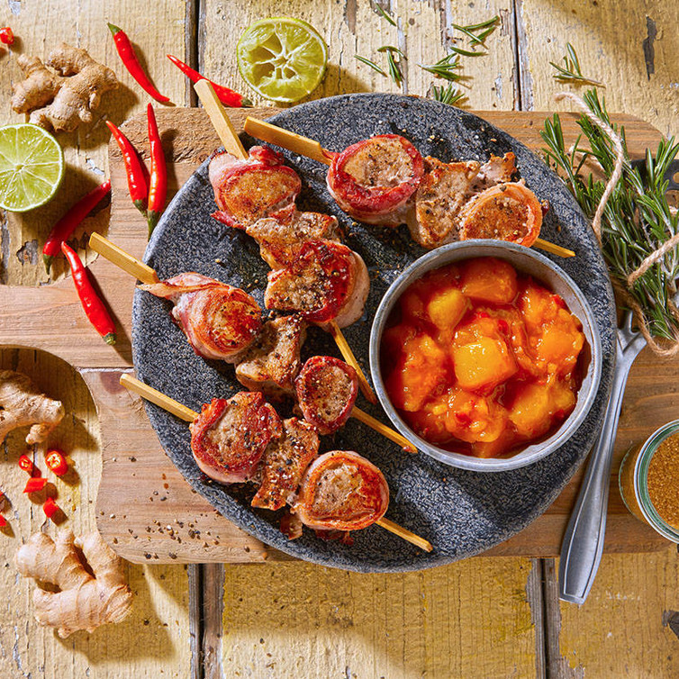 Schweinefilet-Spieße auf Mango Chutney