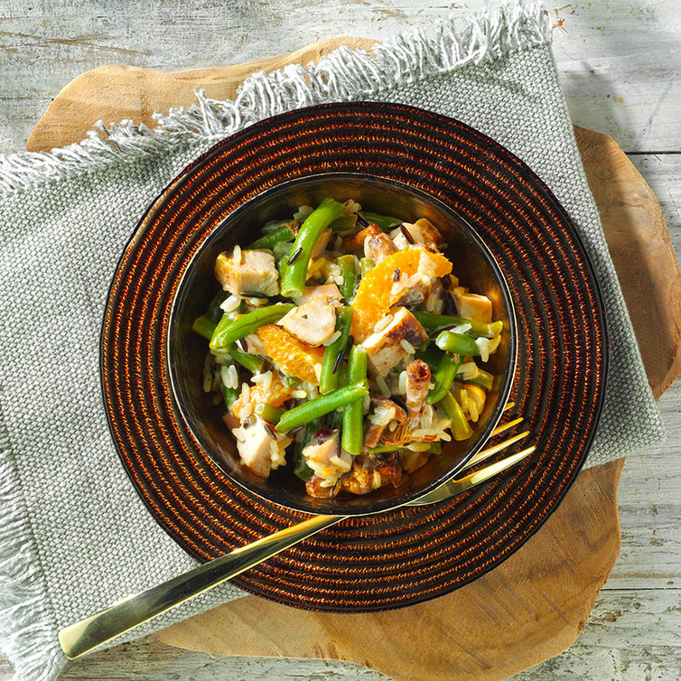 Wildreismischung nach Packungsanweisung zubereiten und abkühlen lassen. Orangen schälen und filetieren, dabei den Saft auffangen. Für das Dressing Salat-Mayonnaise, Saure Sahne, aufgefangenen Orangensaft und -konfitüre sowie Zitronensaft verrühren und mit Salz und Pfeffer würzen.