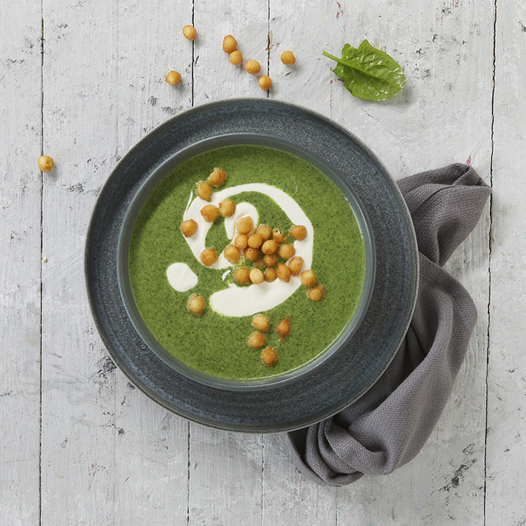 Spinat-Rahmsüppchen mit knusprigen Dinkel Backerbsen