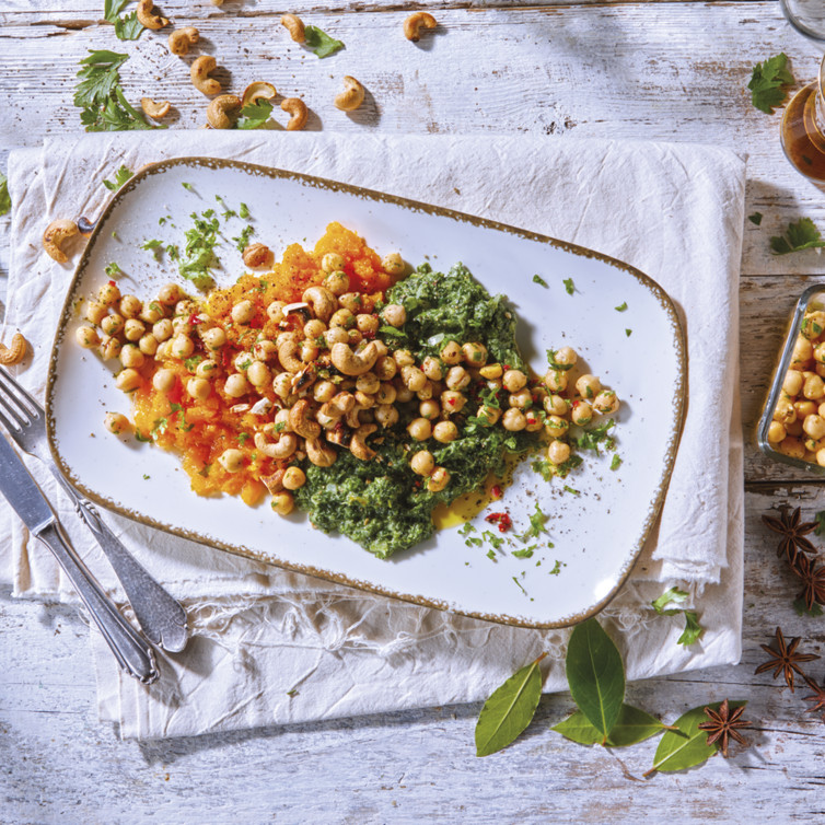 Die Kürbiswürfel mit einem Kartoffelstampfer stampfen und mittig auf vorgewärmte Teller geben. Darauf das Grünkohlgemüse anrichten und oben auf den Kichererbsen Salat. Mit den gerösteten Cashewkernen dekoriert servieren.