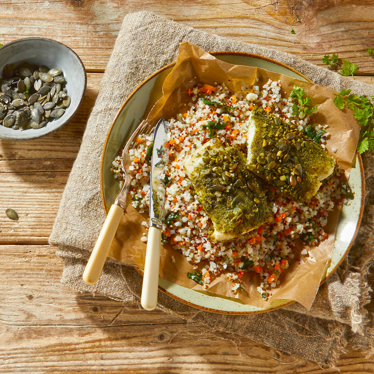 Den Backofen auf 200° C vorheizen, eine ausreichend große Auflaufform mit einem Esslöffel Olivenöl dünn einfetten. Die Kabeljaufilets "Green Island" aus der Packung nehmen und mit der Kürbis-Auflage nach oben nebeneinander in die Form legen. Die noch in der Verpackung verbliebenen restlichen Kürbiskerne über den Fisch streuen. Mit dem restlichen Olivenöl beträufeln und auf mittlerer Schiene ca. 30 Minuten backen.