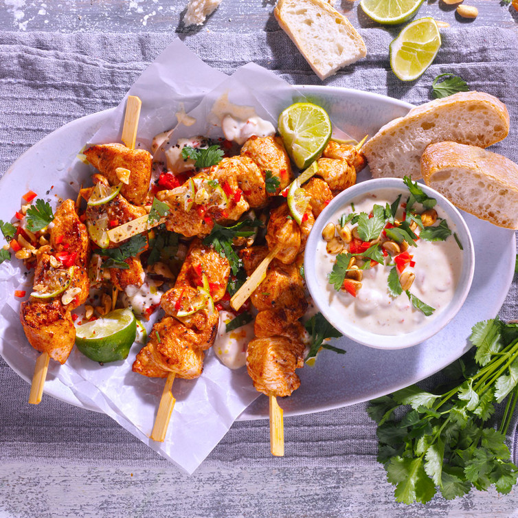 Tandoori-Hähnchen-Spieße mit spicy Erdnuss-Sauce
