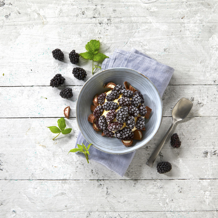 Frische Brombeeren waschen, trocken tupfen, halbieren und in einen Suppenteller geben.