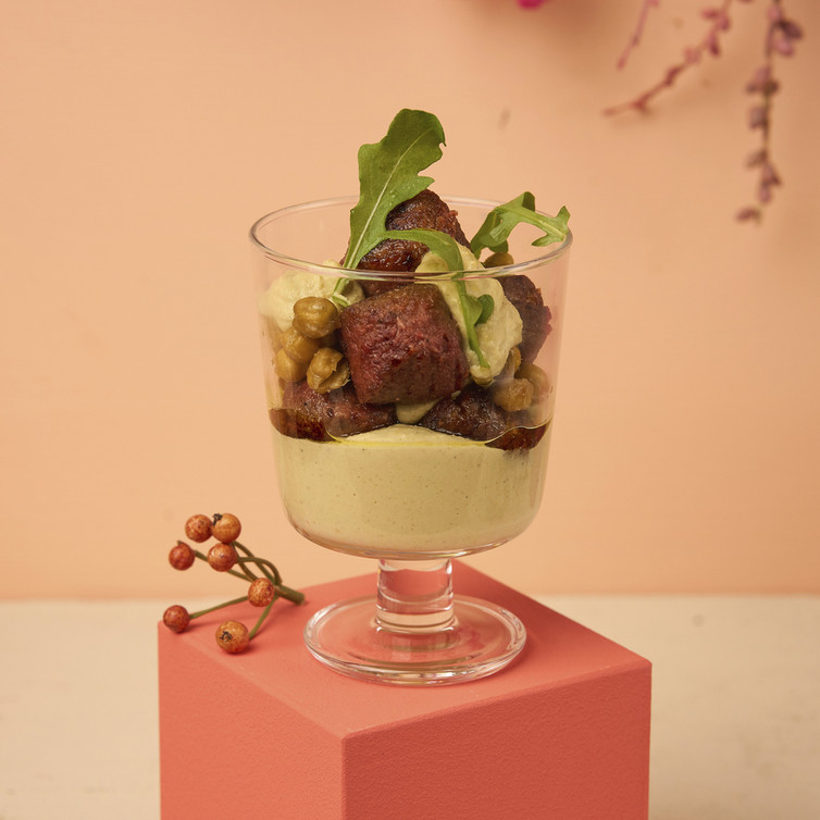 Die Hummuscreme in Gläser füllen, die Kein-Hack-Bällchen und die gebackenen Kichererbsen darauflegen. Mit einigen Tupfen Hummuscreme und Rucola garnieren.