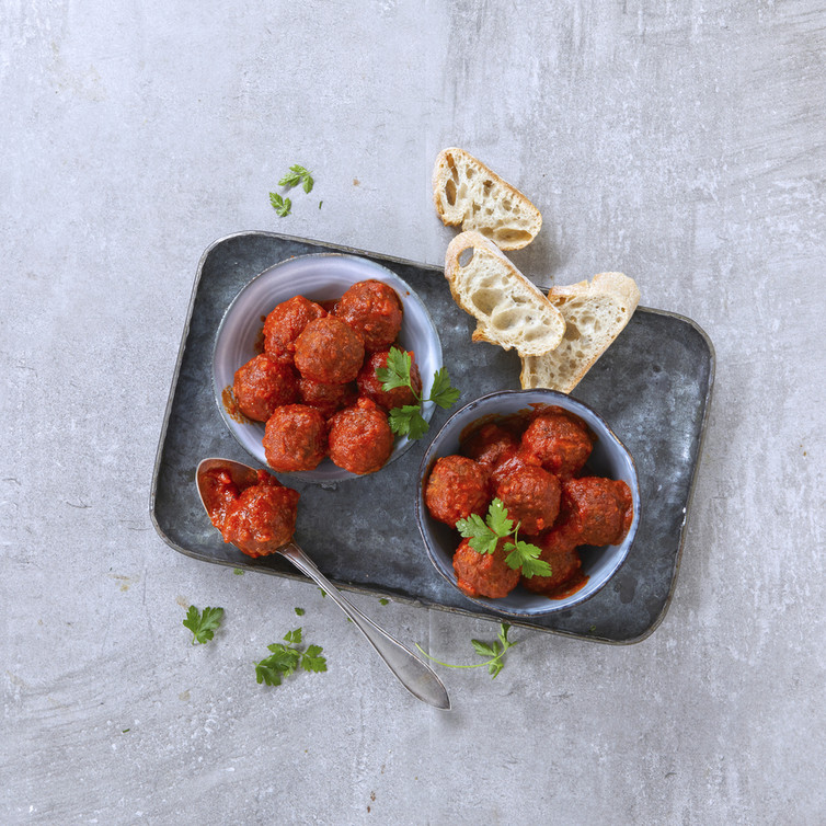 In einer hohen, beschichteten Pfanne etwas Fett erhitzen. Tiefgefrorene vegane Kein-Hack Bällchen in die Pfanne geben und bei kleiner bis mittlere Temperatur für ca. 10 Minuten von allen Seiten gleichmäßig braten. Die Tomatensauce dazugeben, nochmals erwärmen und die veganen Frikadellen gar ziehen lassen. Zum Servieren mit der Sauce auf 4 Schälchen verteilen.