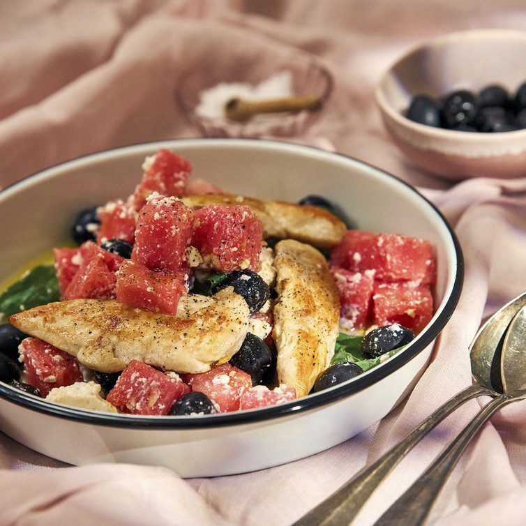 Wassermelonen-Schafskäse-Salat mit Hähnchen