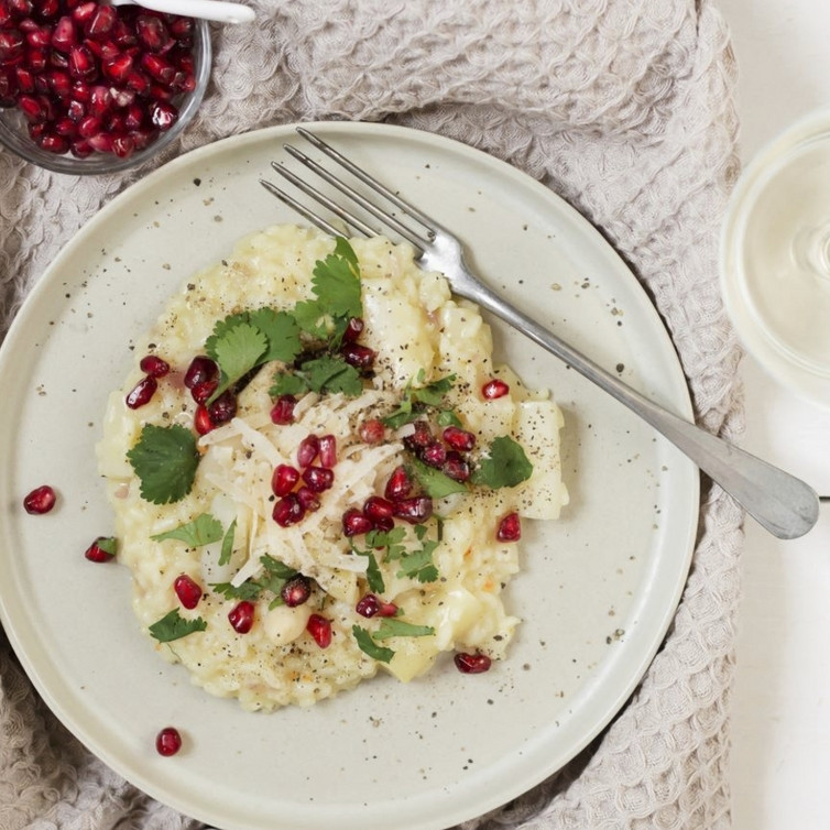 Das Risotto auf Tellern anrichten und jede Portion mit 1 EL Balsamico beträufeln und mit gehacktem Koriandergrün und Granatapfelkernen servieren.