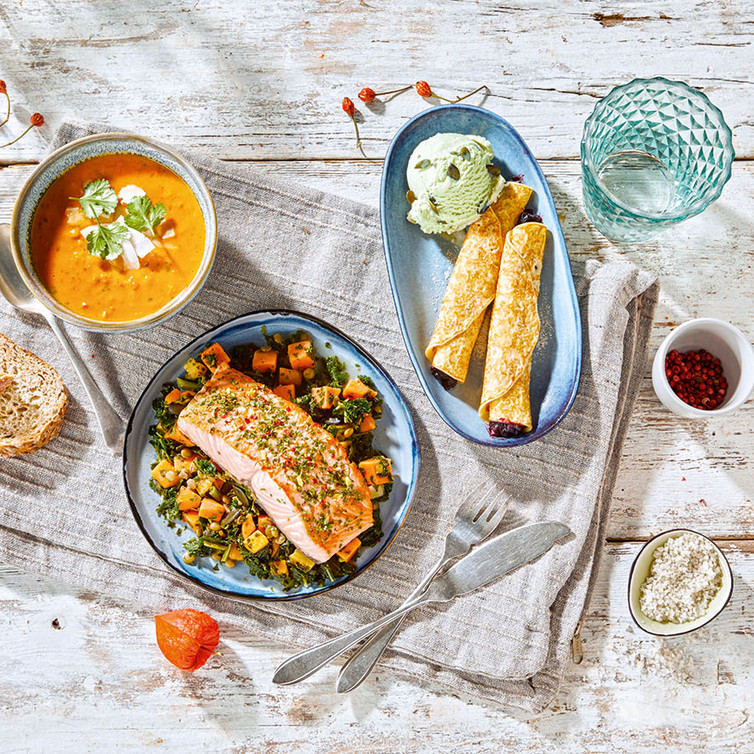 Superfood ist nicht umsonst in aller Munde. Und auch in den Zutaten aus unserer Wohlfühlküche ennera steckt so Einiges: Süßkartoffeln sind z.B. als Ballaststoff-Quelle bekannt. Lachs besticht durch seinen hohen Anteil an Omega-3-Fettsäuren und Grünkohl enthält reichlich Vitamin C. Viele leckere Gründe unser tolles Menü nach zu kochen und es sich mal richtig gut gehen zu lassen.
