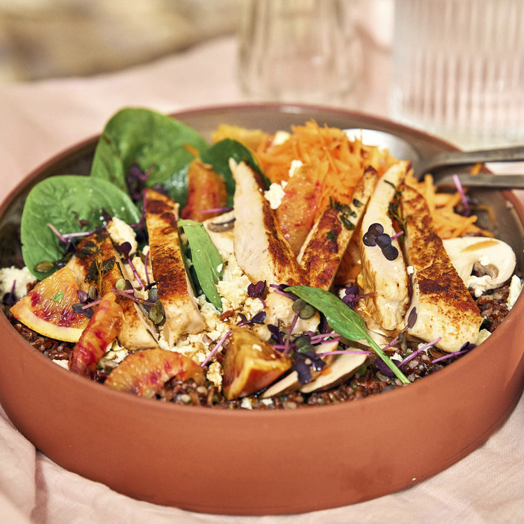 Winterliche Bowl mit Hähnchen, Rotem Reis & Blutorange
