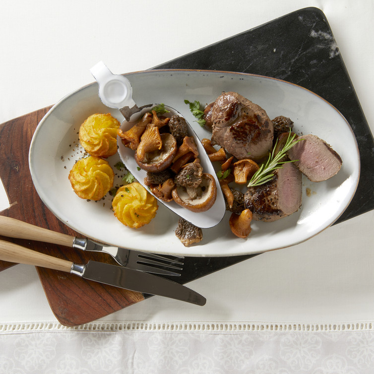 Auf vorgewärmten Teller die Rehmedaillons auf den Pilzen anrichten und die Herzogin Kartoffeln darum dekorieren.