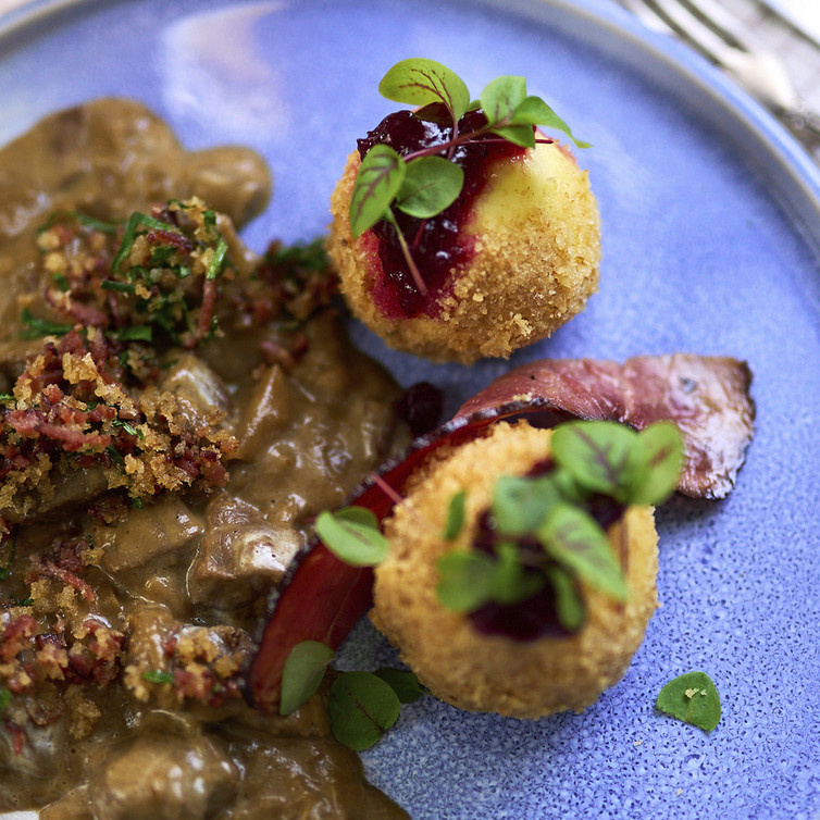 Zwiebelrindfleisch mit Kartoffelknödel und Kräuterpankobrösel (von Johann Lafer)
